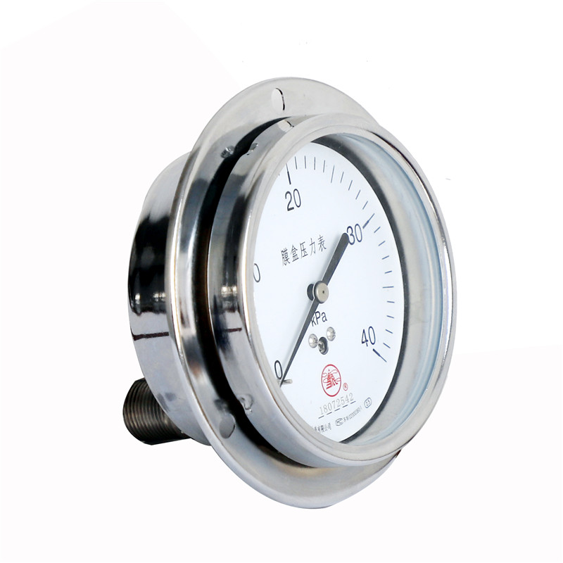 不銹鋼膜盒壓力表采用不銹鋼波紋膜盒作為測量微小壓力的敏感元件。不銹鋼膜盒壓力表適用于測量對不銹鋼不起腐蝕作用,無爆炸危險的氣體或液體的微小壓力。表盤上面有調零裝置,可以方便調整零位。不銹鋼膜盒壓力表廣泛應用于石油、化工、冶金等工業部門壓力測量,不銹鋼膜盒壓力表可以就地安裝并現場指示壓力。本公司可根據用戶需要,設計、制造特殊用途的不銹鋼膜盒壓力表產品,歡迎來人來電、來函洽談!