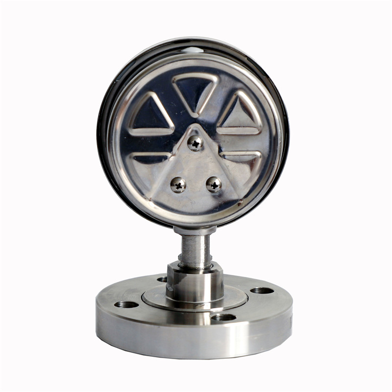 法蘭式隔膜壓力表采用間接測量結構,用隔離膜片將被測介質與敏感元件隔開,與設備采用法蘭連接,適用于測量強腐蝕、高溫、高粘度、易結晶、易凝固、有固體浮游物的介質壓力以及必須避免測量介質直接進入通用型壓力儀表和防止沉淀物積聚且要易清洗的場合。隔離器有多種材料,以適應各種不同腐蝕性介質。儀表適用于化學工業、化纖、合成纖維、石油、染化、制堿等工業,并有各種材質的隔離膜片及各種公稱通徑法蘭接口形式以供不同的工礦條件選用。