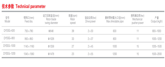 DYSSG系列撕碎機可用于直徑1200MM的PE,PP,PVC管材撕碎,長度達3-6M的管材直接破碎,無需分割,其轉速緩慢運轉平穩,各種管材放入水平的喂料槽中,喂料槽自動關閉由液壓推進將管材推向軸中心進行破碎。撕碎機破碎后的材料通過輸送機帶入二次破碎完成需要的破碎顆粒直徑。
