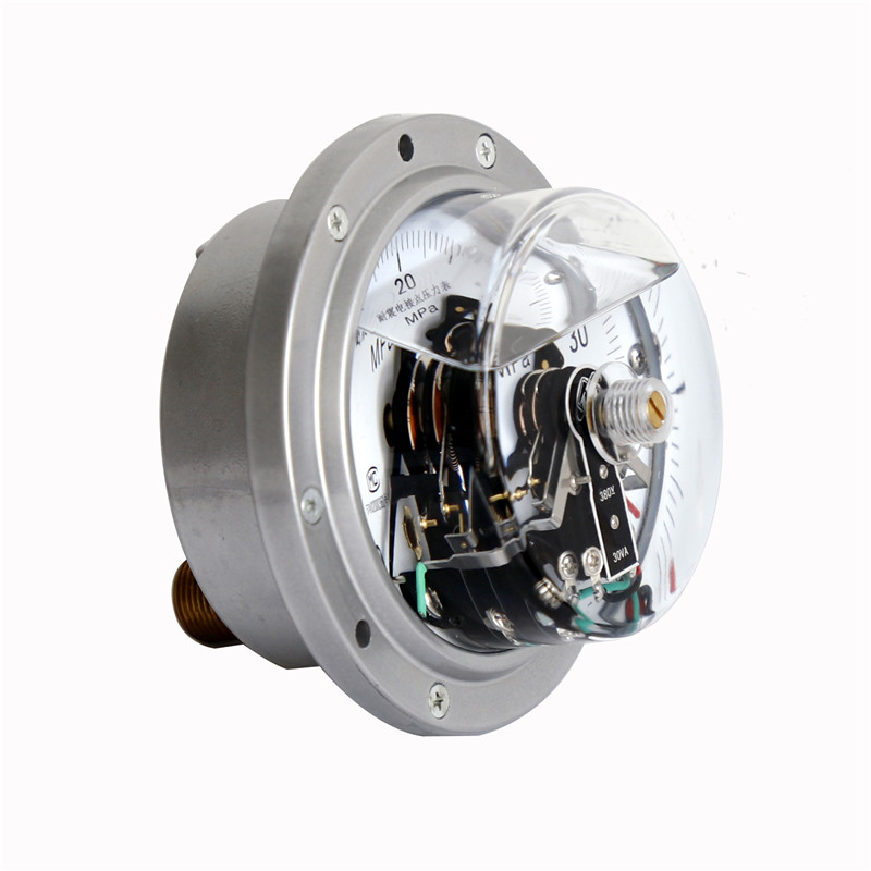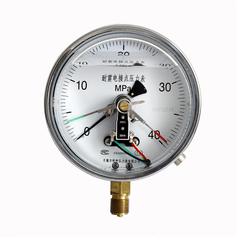 耐震電接點壓力表具有抗介質脈動和沖擊載荷,耐環境振動等優異特性,適用測量對銅和銅合金無腐蝕性的氣體,液體或蒸汽等介質的壓力測量和控制,儀表設上、下限二位開關型接點裝置(可選雙上限或雙下限接點裝置),在壓力達到設定值時發出信號或通斷控制電路,供作業系統自動控制或發訊用。其抗振結構可有效抑制指針的抖動、沖擊,保護接點,使儀表指示清晰,電信號切換可靠,工作穩定。廣泛應用于機械、化工、石油、冶金、電力等工業生產過程壓力測量和控制。